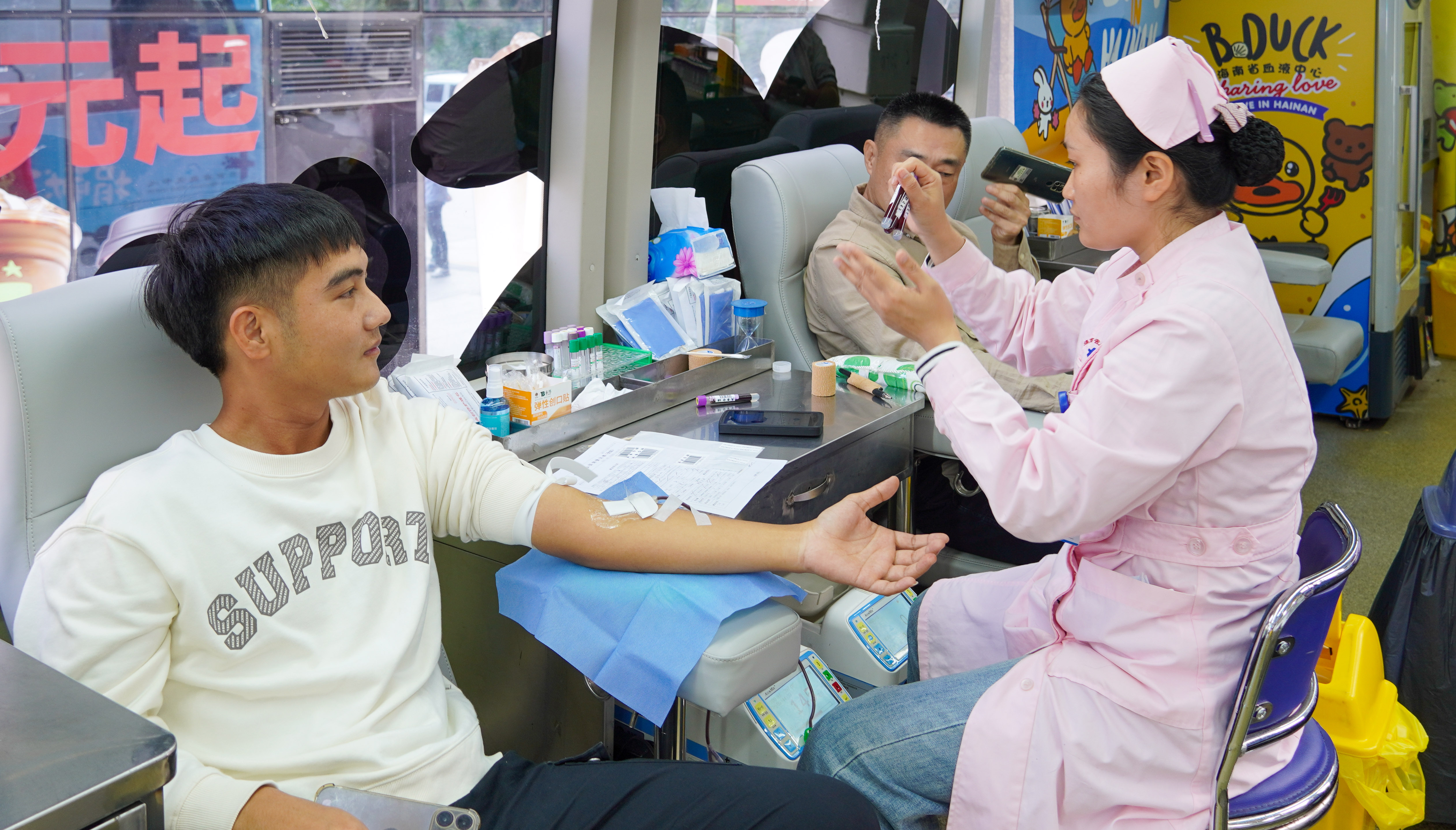 活動現場,參與獻血的員工們在海南省血液中心醫務人員的指導下,有序完成信息登記、血壓測量、血液化驗初篩等流程后進行獻血。獻血的隊伍中既有多年堅持無償獻血的“老將”,也有初次參與的“新兵”,從黨員到海南民生燃氣等分子公司的員工,大家以飽滿的熱情加入到這場“熱血”的隊伍中。